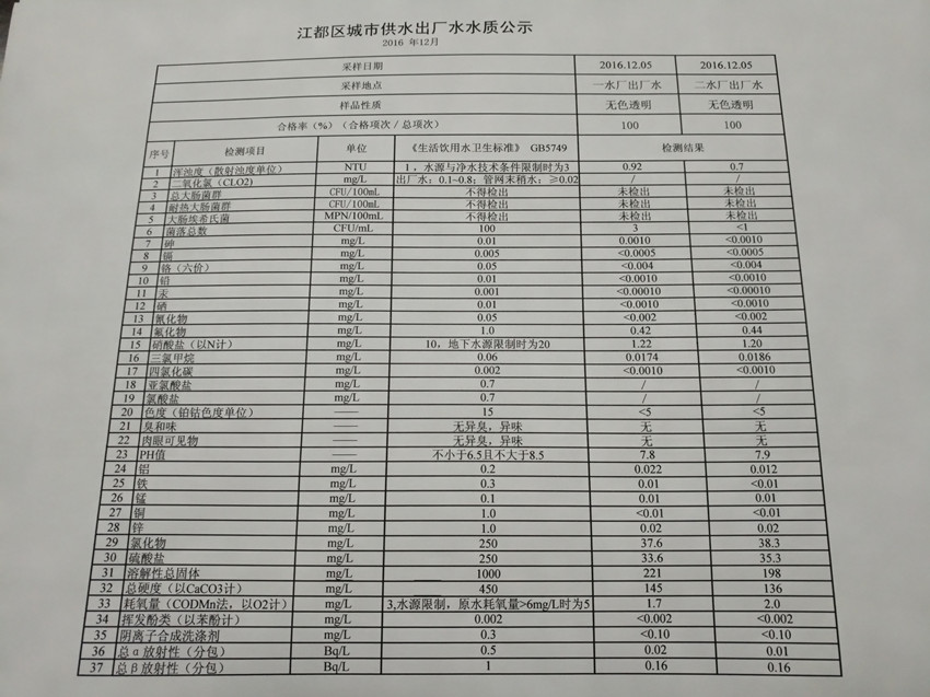 2016年12月江都區(qū)城市供水出廠水水質公示