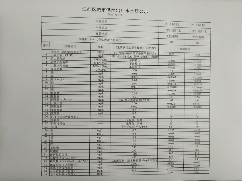 2017年6月江都區(qū)城市供水出廠水水質(zhì)公示